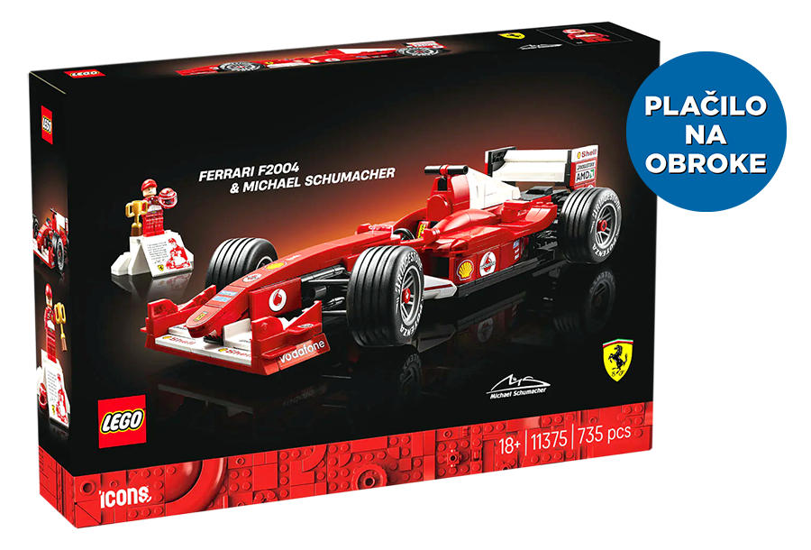 Sestavite LEGO model v pomanjšanem merilu legendarnega dirkalnika, ki je z Michaelom Schumacherjem za volanom zmagoval v dirkalni sezoni 2004. Model ferrarija ima delujoče krmiljenje, rebraste pnevmatike in podroben motor V10 ter razstavno stojalo s podatki o vozilu in statistiko.